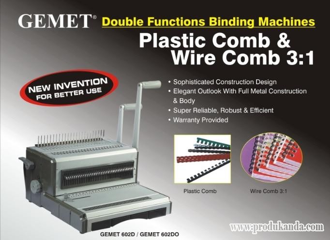 Mesin Gemet 602D ( wire lubang kotak) / 602DO ( wire lubang bulat) berguna untuk proses jilid dengan bahan jilid kawat & plastik ( dual fungsi) dan ukuran kertas hingga F4 atau lebih besar. Mesin ini dapat digunakan untuk memakai bahan-bahan jilid kawat & plastik yang umum dan banyak dijual di pasaran. Dengan mesin ini Anda dapat melakukan pemilihan lubang kertas ( pisau dapat diatur) . Dengan standard kualitas internasional, kami memberikan jaminan mutu terbaik dengan harga yang terbaik untuk Anda! Garansi produk 1 tahun servis.